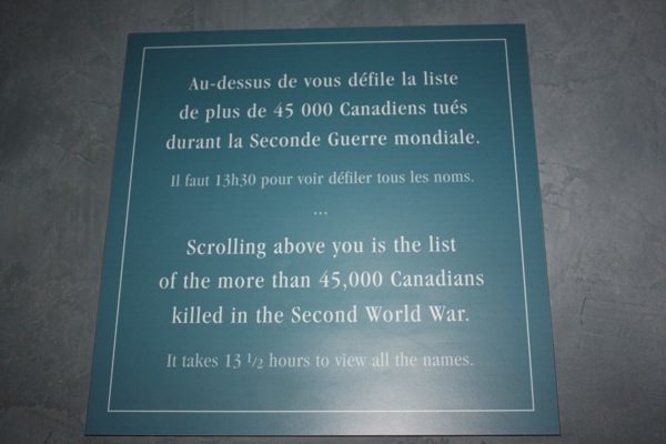 They wanted to have a place that would tell the story of the Canadians who had fought and died so far from home. And they wanted it for the children and the children’s children, down through the generations. That is why they bring young people from Canada to work at the museum. The student who guided our tour said she was the same age as the Canadian (and British and American and Dutch and Norwegian and other) boys who came up the beach in a landing craft on D-Day (the same age as the German boys who tried to stop them.). So at the end of the tour we all clapped and she was just leaving when I asked her if she knew any more about the story of the veterans who had the idea to build the museum.
