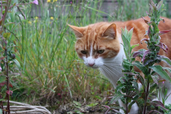 For example when I get up in the morning, he gets my attention from outside by making rubbing sounds on the window with his paws. As soon as I open the door he leans up against my leg and I rub his head. We walk together to the larder where he meows his wish for me to get his food out. When he’s sure I have the food he runs over to his bowl and waits there for me to catch up. He likes to start with dried food and then follows that with a little packet of fish in gravy. He’s a fish-eating vegetarian… doesn’t like meat.