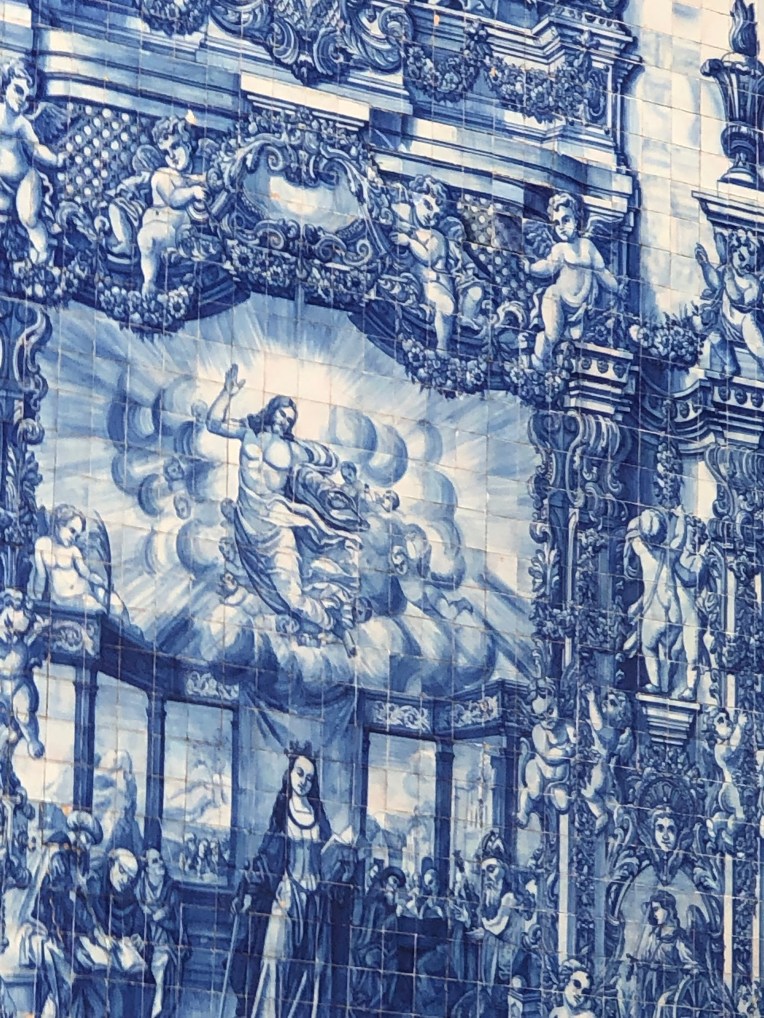 (Close-up of one of the tile scenes on the exterior, telling the life story of St. Catarina. I can’t remember the details but if she’s anything like the other saints it was difficult and had a very sad ending)