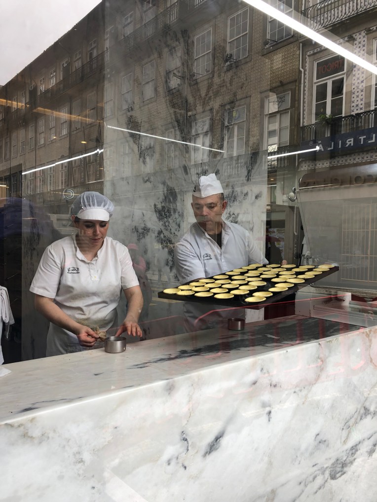 (At the windows of the Fábrica de Nata cafe you can see the bakers making Natas. When a new batch is ready one of the bakers rushes outside ringing a hand bell. You can hear it two streets away!)