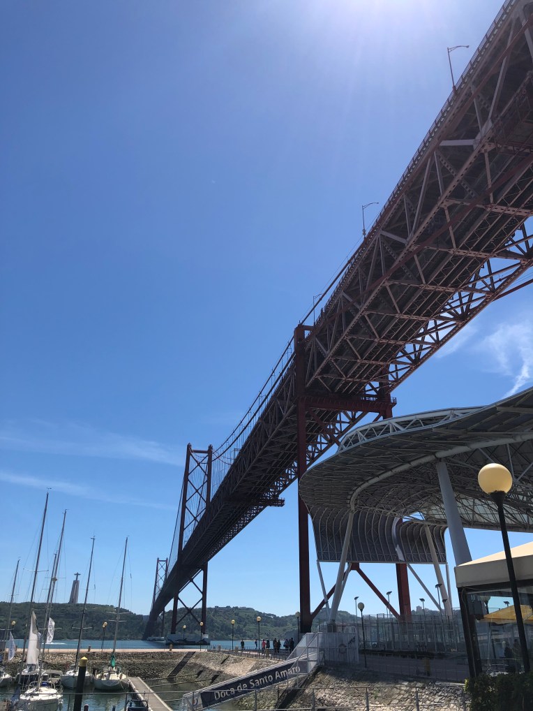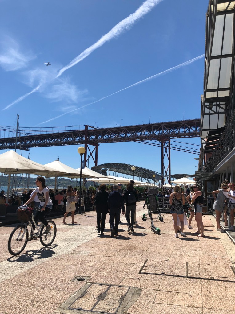 When we got to Lisbon’s huge red bridge (25th April bridge the one we drove over the previous Thursday, 25th April?) it was hot, there’d been loads of people on the bike path including a tiny toddler (aaah) I was tired and ready to give up. So we signed off on the scooters, parked them beside a cafe and walked away.