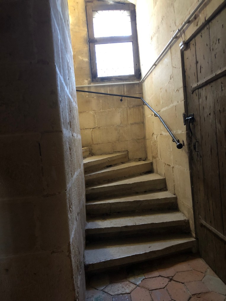 (Stairs to Apartments of Princess Margaret) We make energy when we drive and we have been driving for 90 minutes today. We also make energy when the sun shines and although it is much colder today (7 degrees Celsius this morning) the dark clouds are gone and the sun is shining on our solar panels.