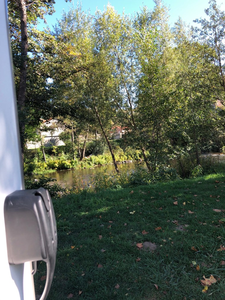 The difference a few hours makes. We drove to the town of Massiac after the fog show. The sun shone the whole way and the temperature rose… to 23 degrees! That’s 19 degrees hotter than in the morning. Massiac provides a beautiful space for camping cars (that’s motorhomes) alongside the river, so we were very comfortable.
