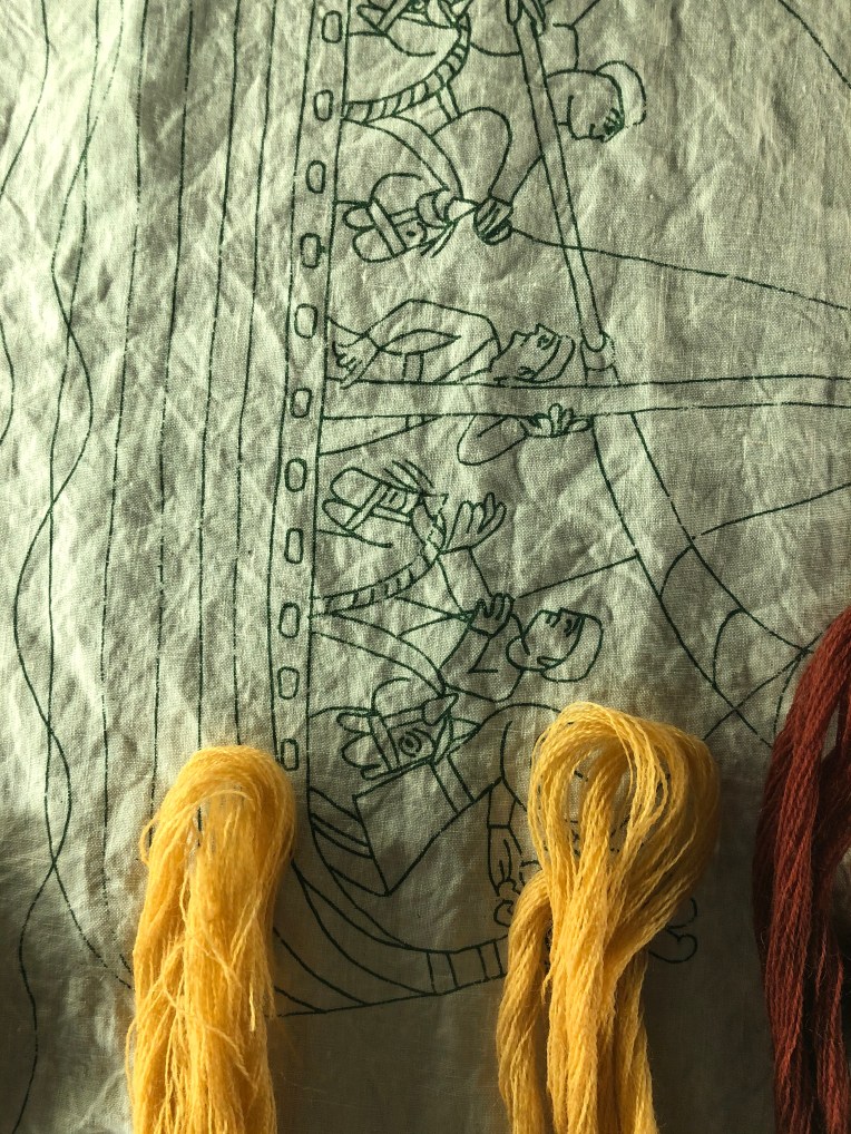 (Here’s the basic ingredients – linen fabric with design drawn on and thread for the stitches)