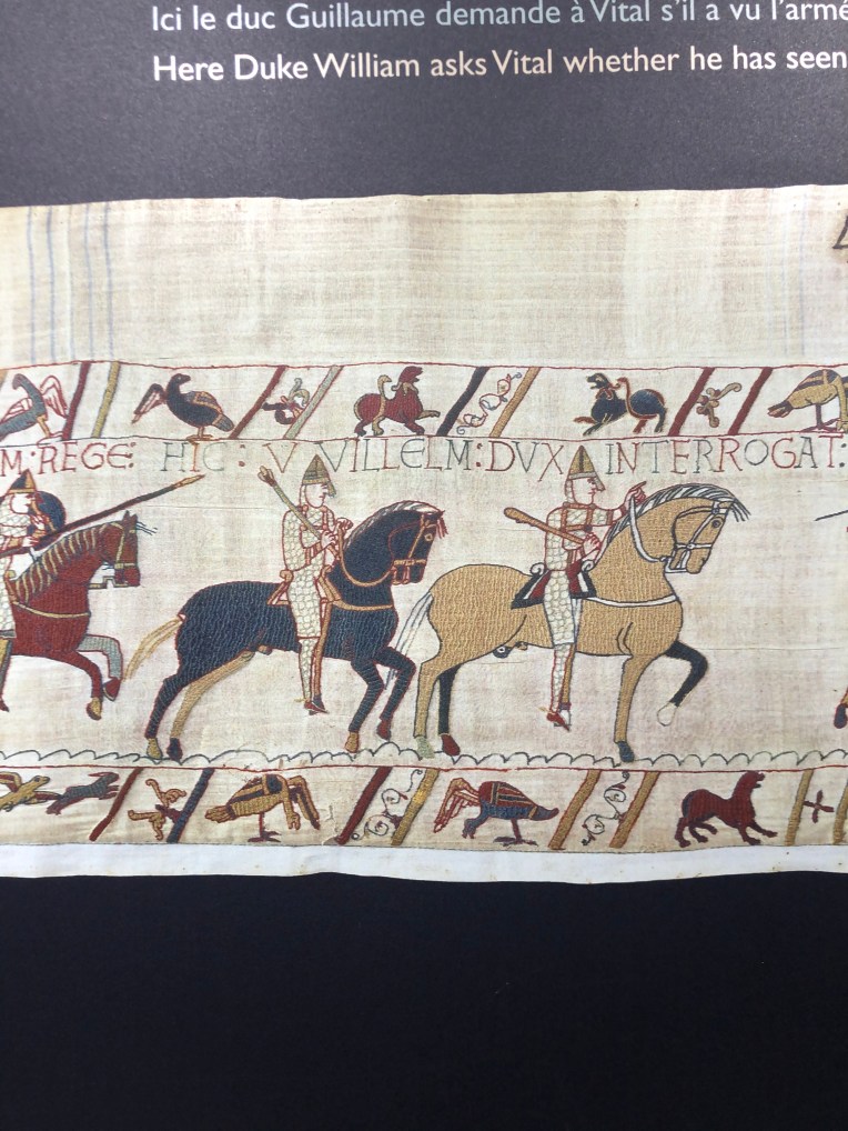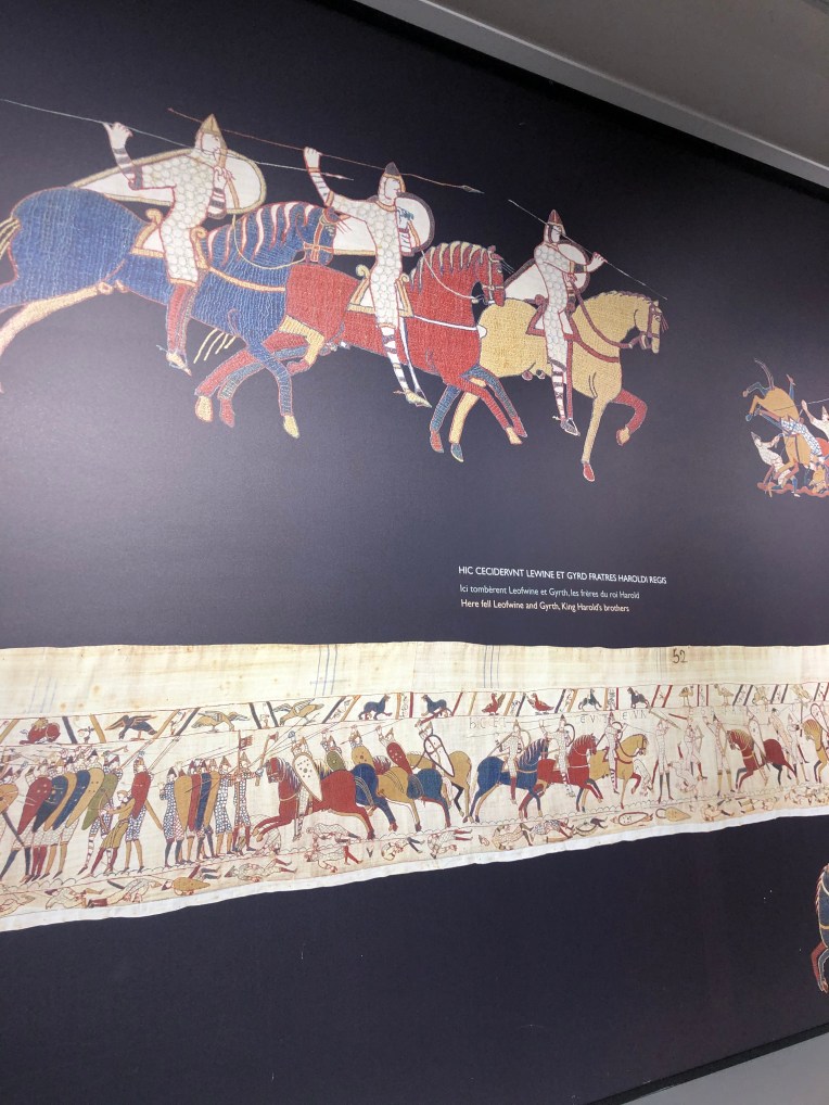 We’re in Bayeux, an absolutely beautiful town and home to the Bayeux Tapestry. A 70 meter long, 58 panel, linen craft piece housed in the dark in a big house in Bayeux. You cannot take pictures of the tapestry… but fortunately they have replicas and photos they took themselves so I have something to show you.
