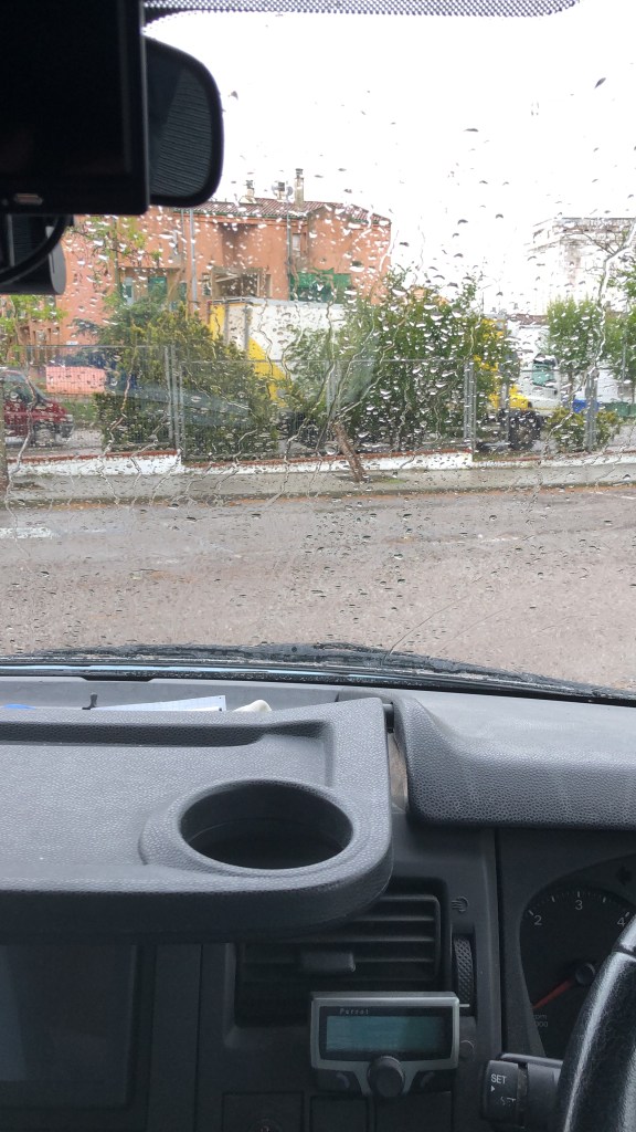 I’m sitting in the van with a quilt on my knees. Outside the rain is lashing down and the forecast says it will continue until tomorrow evening. Meanwhile the sun is shining in Greystones. But we are here now and because we’ve had lots of days of heat we are starting to be grateful for a day of cool rain… that gratitude never happened at home. Maybe you have to travel far from home to appreciate what is right beside you.