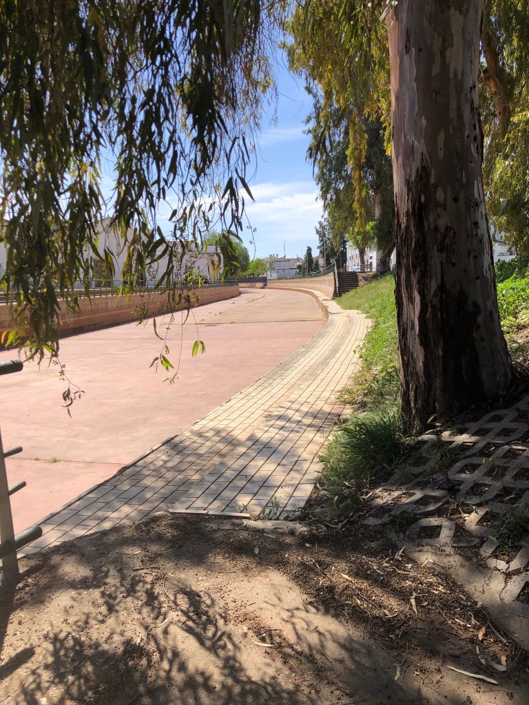 We are in the city of Zafra. We arrived this morning from the town of Villafranca de los Torres. We knew the rain was coming and decided it might be better to be in a bigger city. Plus the park up in Villafranca has a lot of sandy areas that could get very muddy in the rain. It also has what looked like a dry river bed or maybe canal. I have searched the internet to discover what its purpose is but have had no success. When we arrived yesterday I could see a team of workers clearing some dust and leaves down there. I mimed asking if it was okay for me to be walking in the river/canal and they mimed back, yes, no problem.