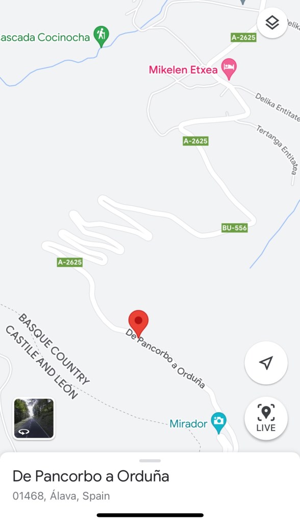 Following our trusty guide app we left Guernica and travelled in the direction of Burgos and came to Puerto de Orduña. The scenery was beautiful. We never guessed down in the valley that the amazing cliff rising up in the distance was where we were going next but it was.