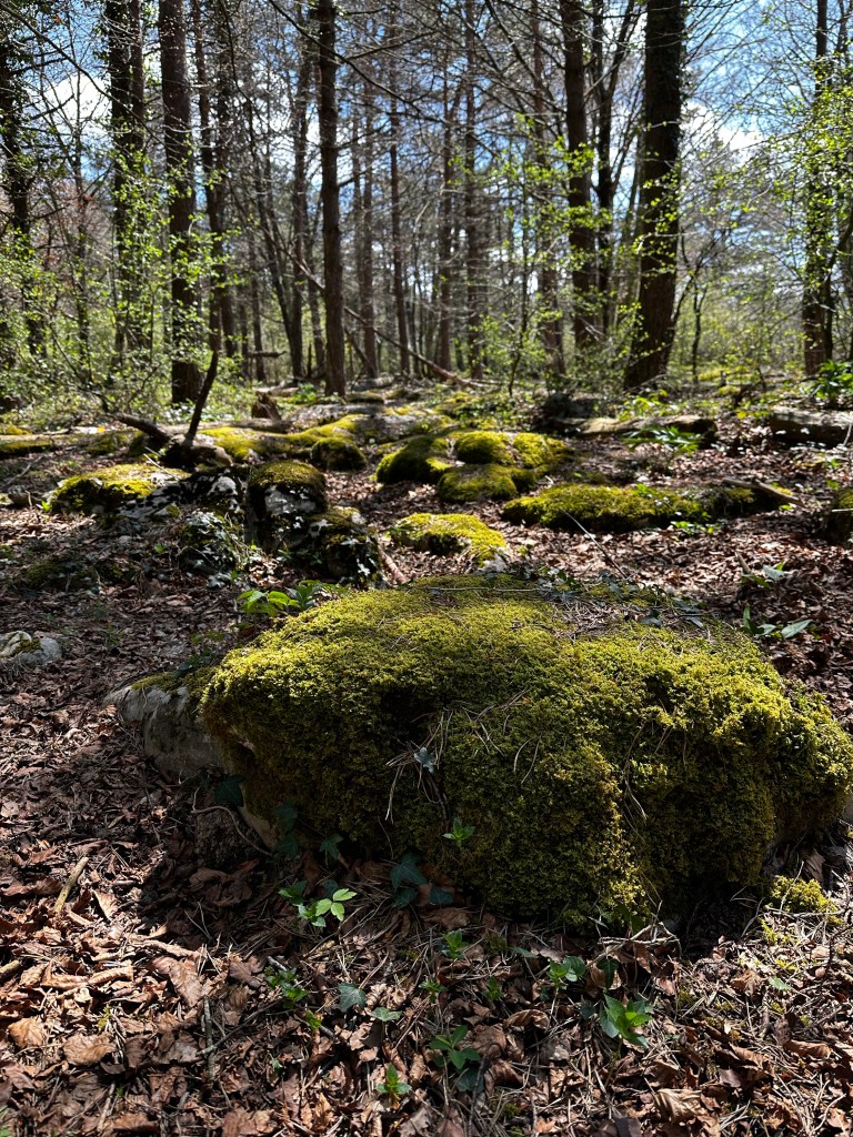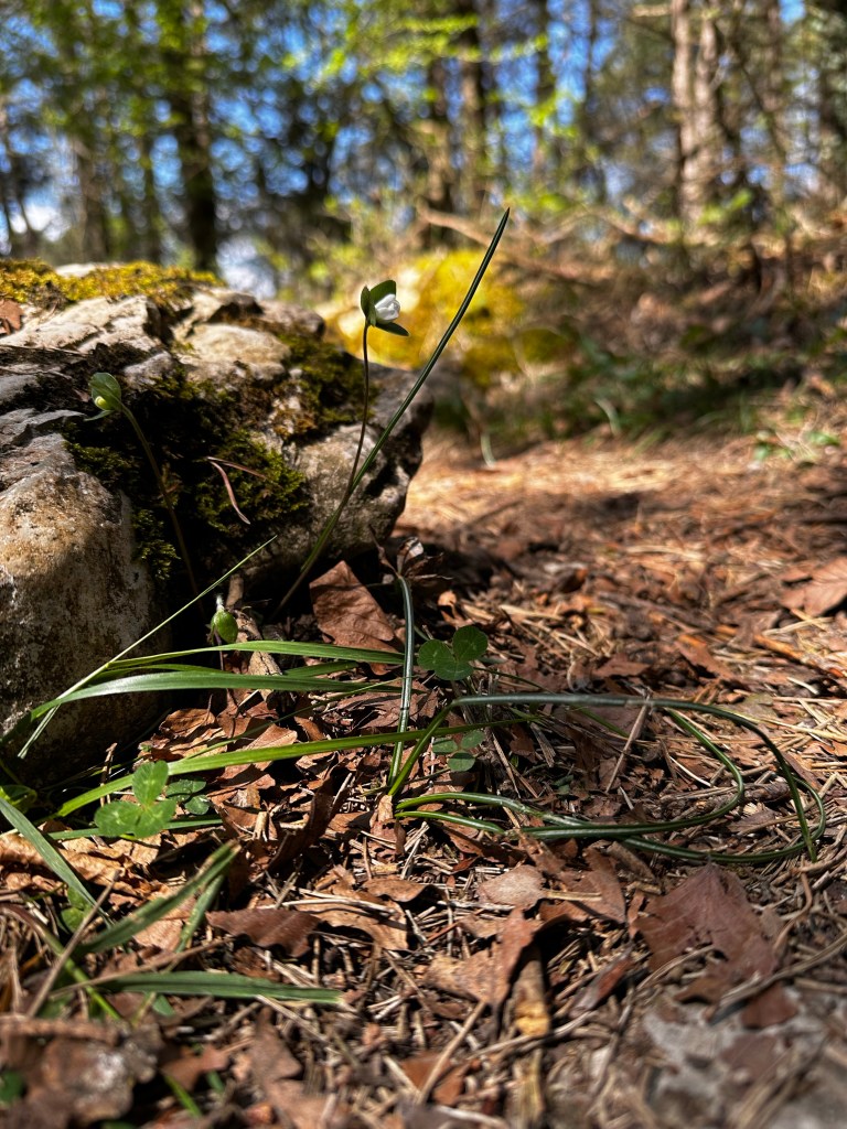 The sign in the car park said there was something in 3km. Maybe the waterfall? Sure even if it isn’t that’s a grand walk, so we set off. Almost immediately we saw similarities with the Burren. How could that be? No idea! We walked through a shady forest and saw tiny flowers, moss covered rocks and bare flat stones. There were markers on trees and sometimes on the rocks or small stakes to guide us along. When we had reached the 3km there was no sign of the waterfall and it was hot. We had walked enough today, we could be kind to ourselves… and go back.