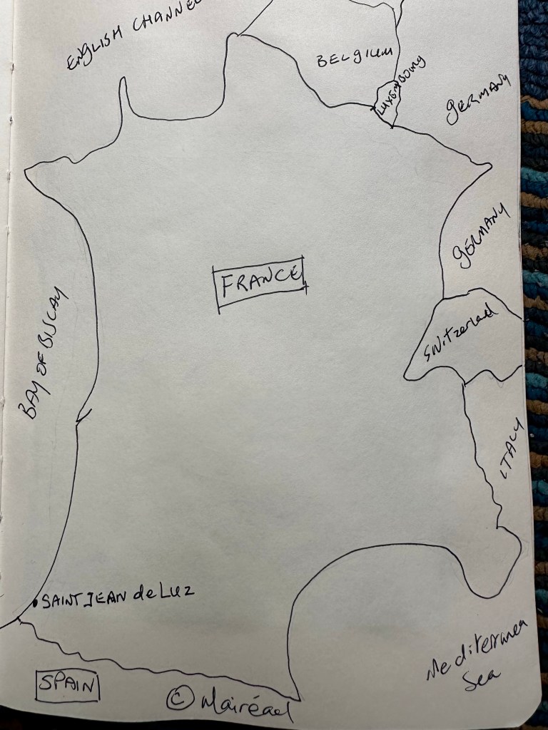 And then we were in France. First stop the big supermarket in St Jean de Luz. There’s a supermarket, cafe, restaurant, clothes shop and we only realised today – a beach! We didn’t go to the beach but we saw it because we took a different route out of the supermarket and passed it and the pretty town. Well, France does keep surprising us.