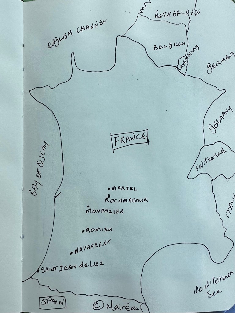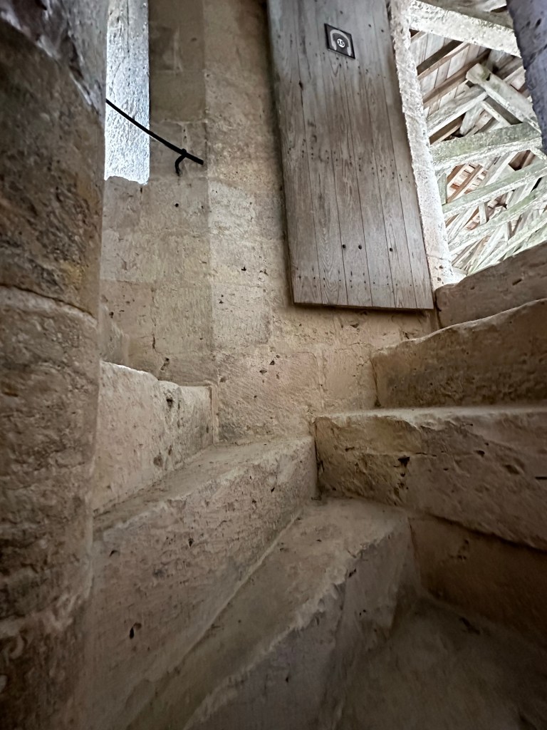Next stop, Romieu. Do you remember, this village began when two monks returned from a pilgrimage to Rome and Santiago de Compostela? Here’s some pictures of the outside and inside of the tower we climbed via spiral stone staircase.