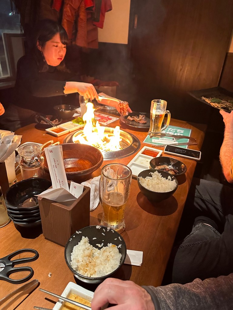 Last night we went to a Korean restaurant in Shiori’s home town. It’s called a Yakiniku restaurant and you get to grill your own food. We had a room to ourselves and we sat at a big table with two grills set into it. The table was lower than the floor but there was space for our legs underneath, making it easy for us westerners to sit without embarrassment. Although getting back up was a little messy, I don’t think anyone noticed…