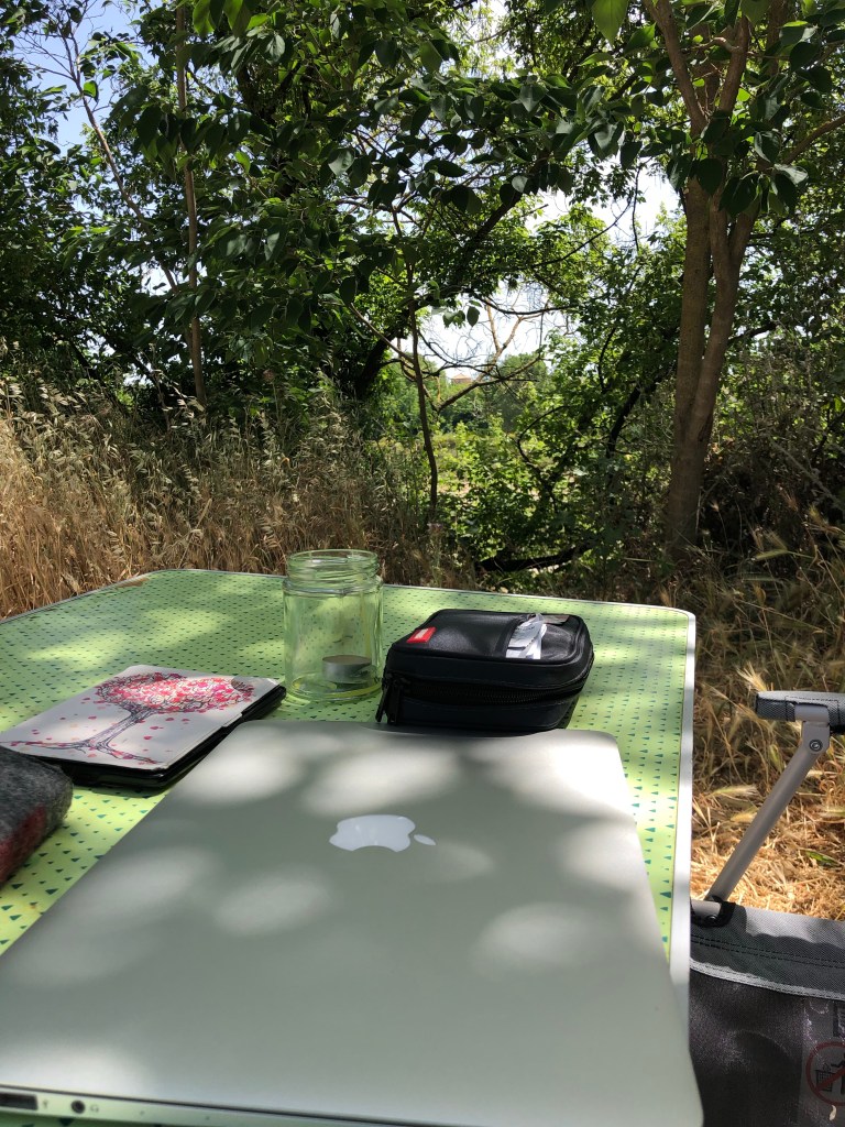On Sunday there was a market on the streets of the village. Mainly flowering plants but also baskets, hats, jewellery and food. The place was hopping so much so the camping car parking was full of cars. It’s a surprising thing, coming from Ireland, that the French reserve parking places for camping cars just like they keep parking spots for disabled drivers. We can’t really blame them if they park in our spot on a busy market day.
