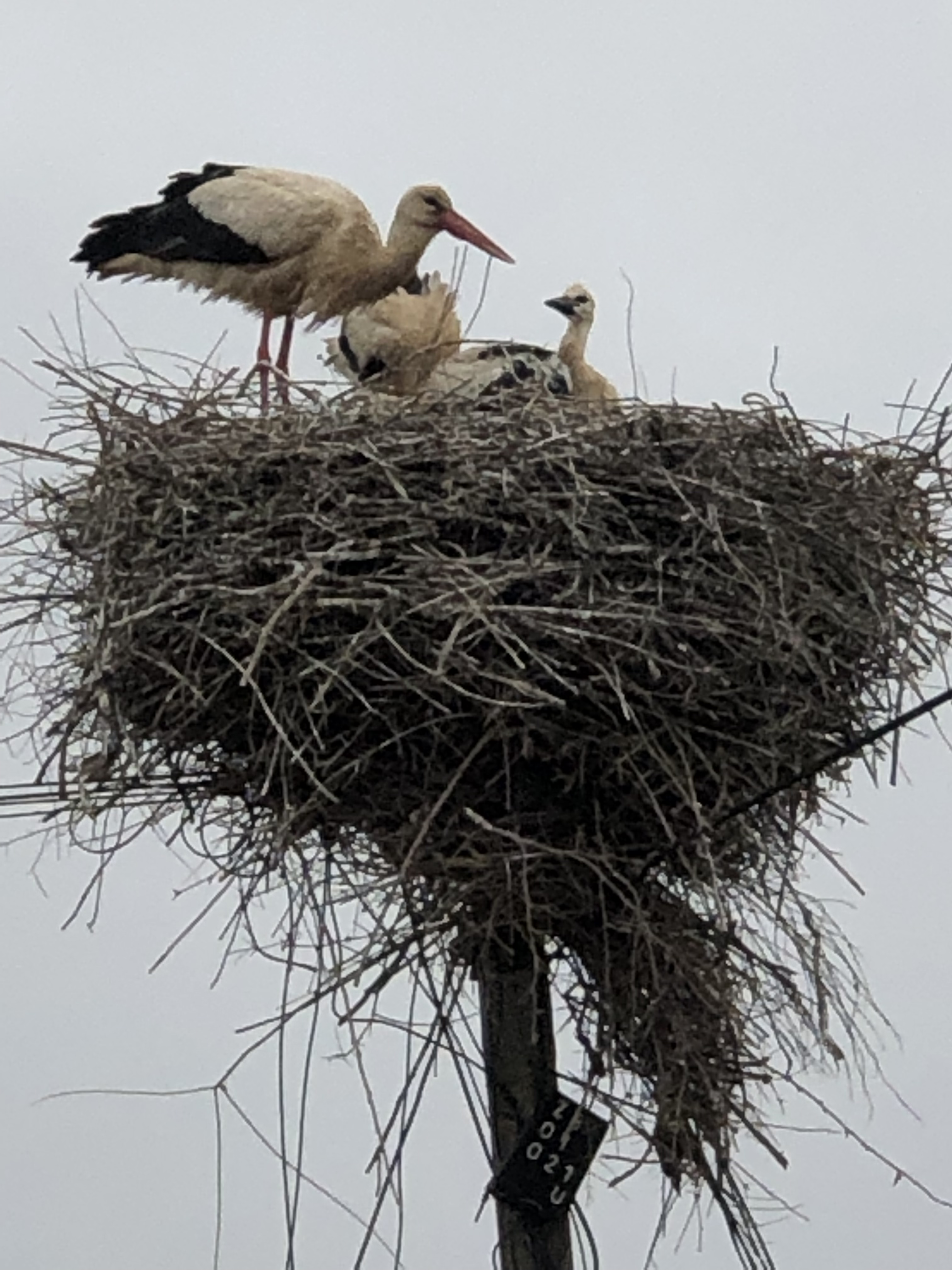 The storks build their nests on top of electricity poles or tall chimneys or on the corner of a very tall abandoned house. They are so graceful when they fly off to find food for their chicks. I think their grace is connected to their size, they have to glide everywhere to remain in balance. The ends of their wings are like long fingers and I think that’s what they use to change direction. When they have picked a direction their long legs seem to click back against their abdomen so that they are streamlined.