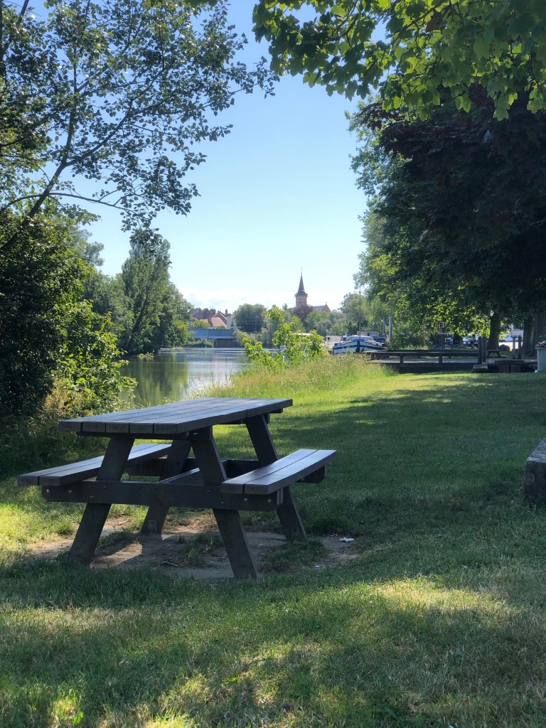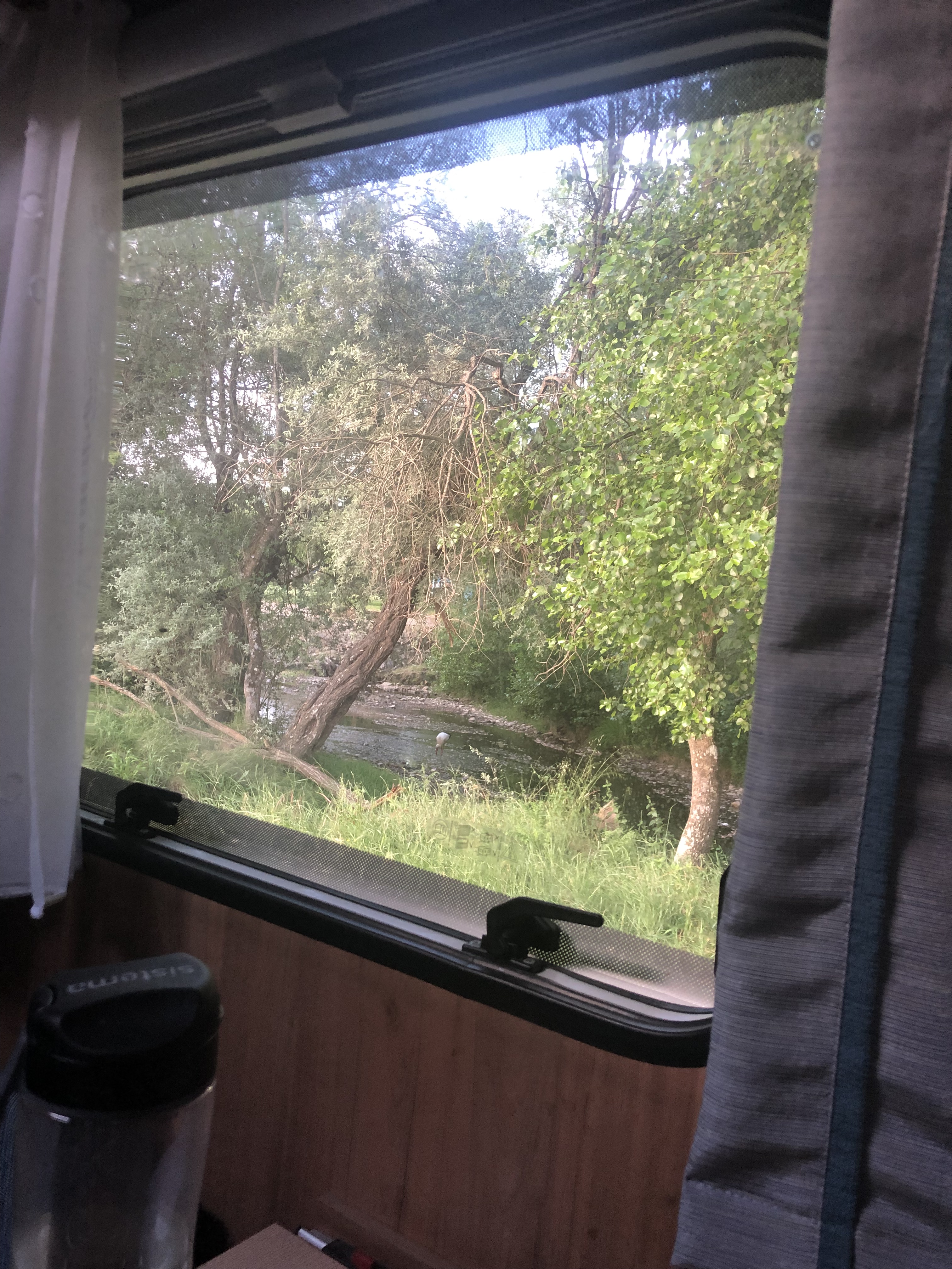 When we arrived it was full of camper vans and motor homes and there was a spot for us beside the river. The temperature was high but there was shade. With the solar panels we don’t normally park in shade but as we’d been travelling for hours our battery was full.