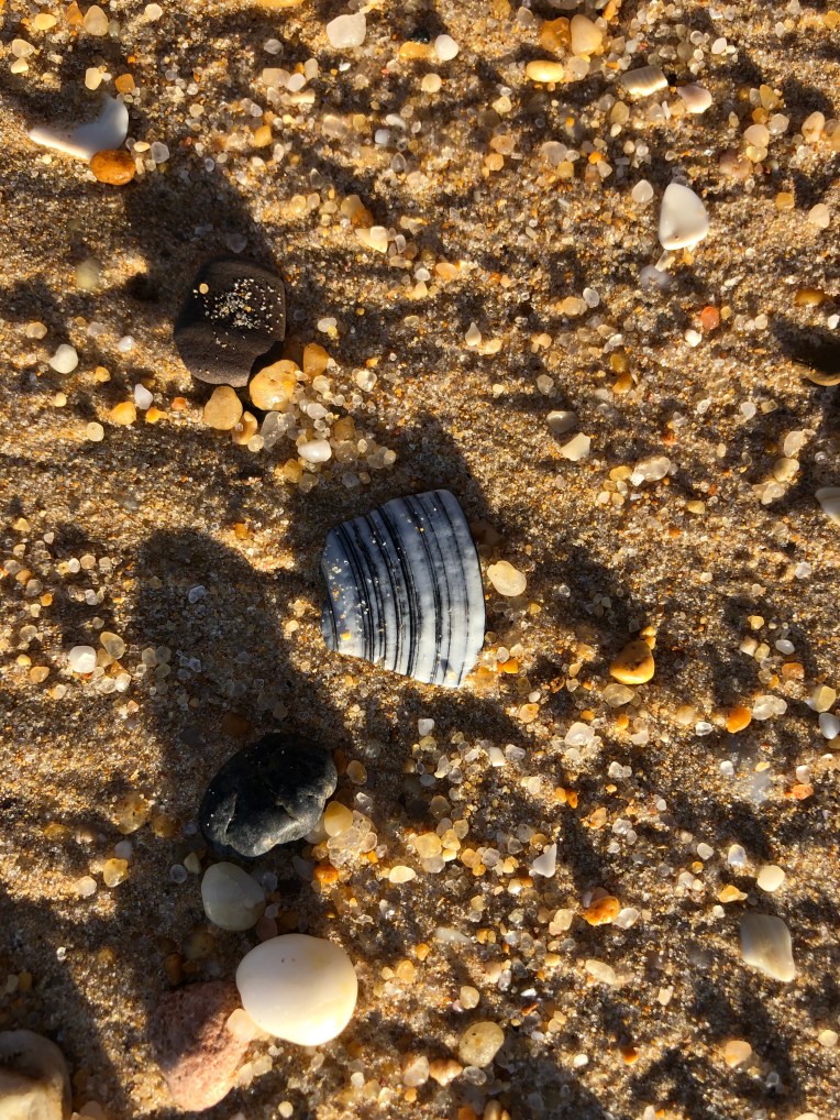 I love broken shells not the sharp edged ones, I like the one that have been in the sea awhile. The ones that have been sanded… by the sand. There are plenty here. Their rough edges are smooth and each one is a different shape.